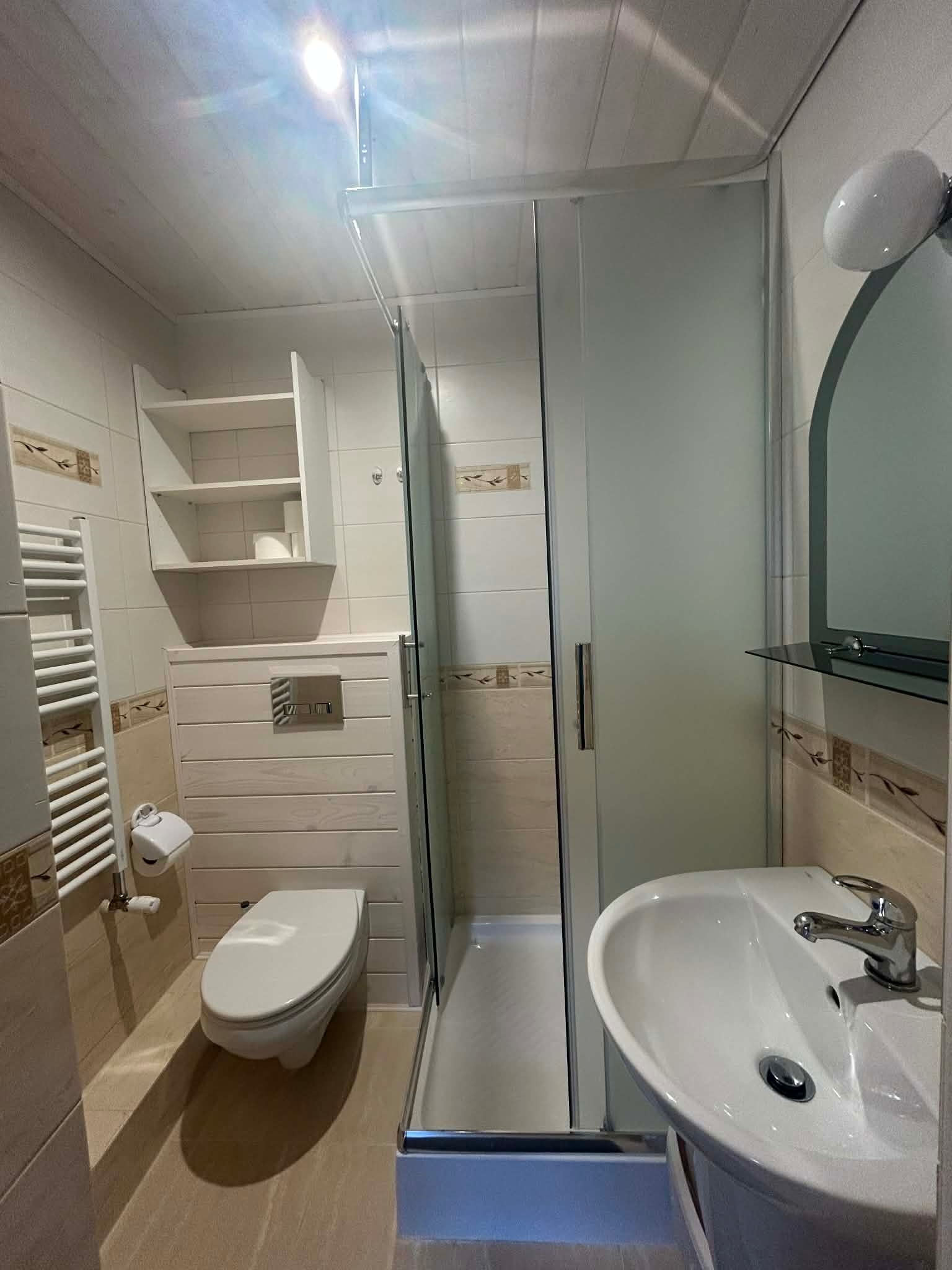 Każdy pokój i apartament posiada własną łazienkę wyposażoną w prysznic, umywalkę oraz WC.